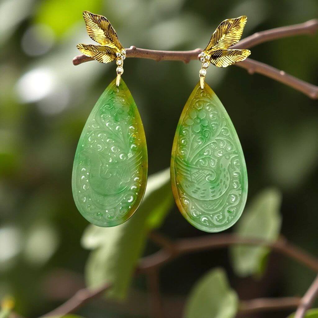 made of 18K gold diamonds in the shape of feathers, and matched with marquise-shaped orange-red jadeite petals.