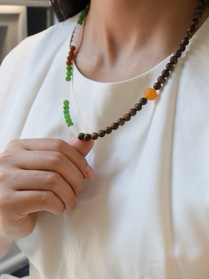 The Hetian jade Burmese yellow volute-patterned barrel beads are the finishing touch, allowing the bracelet to double as a necklace. It's incredibly beautiful